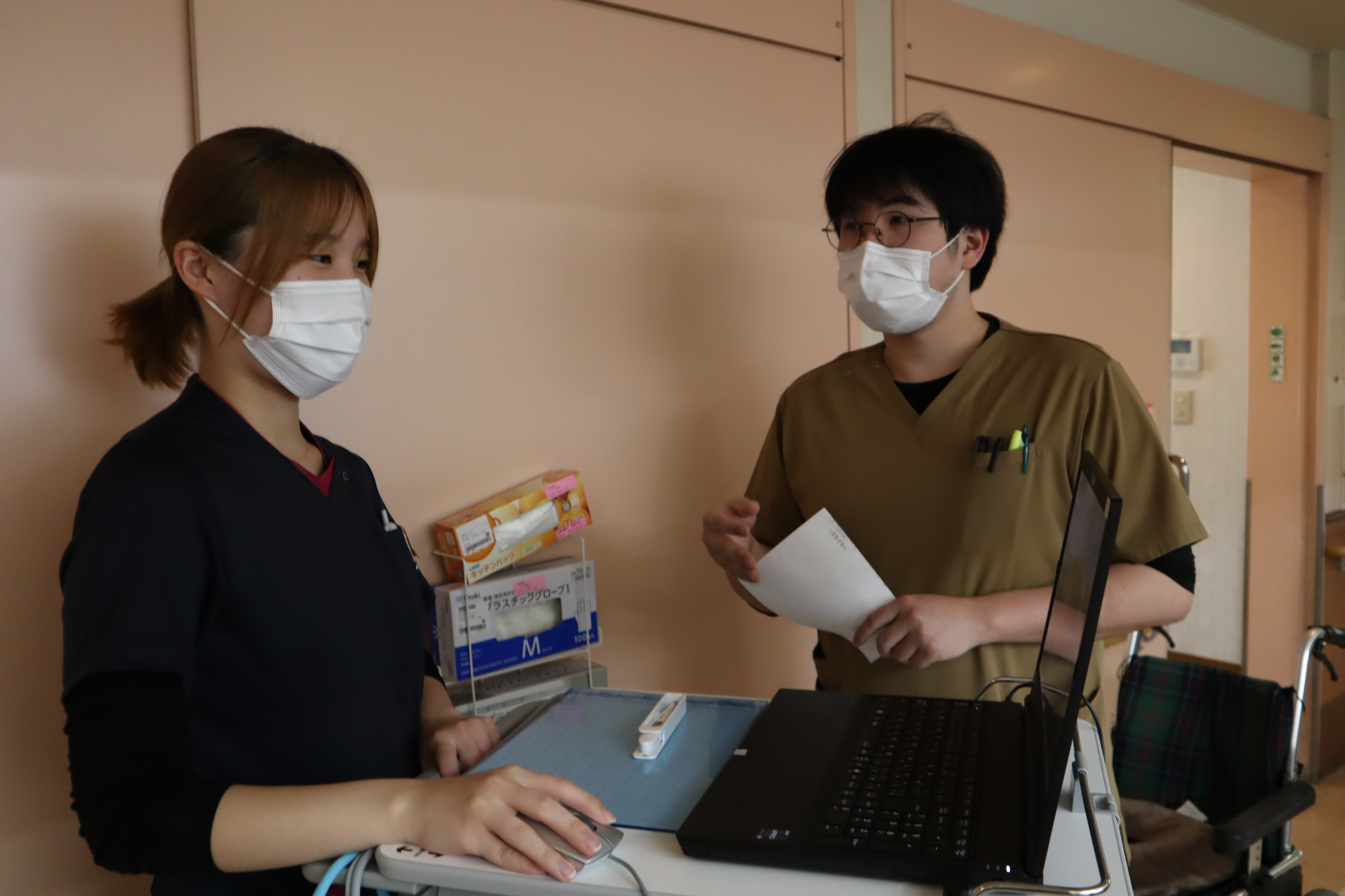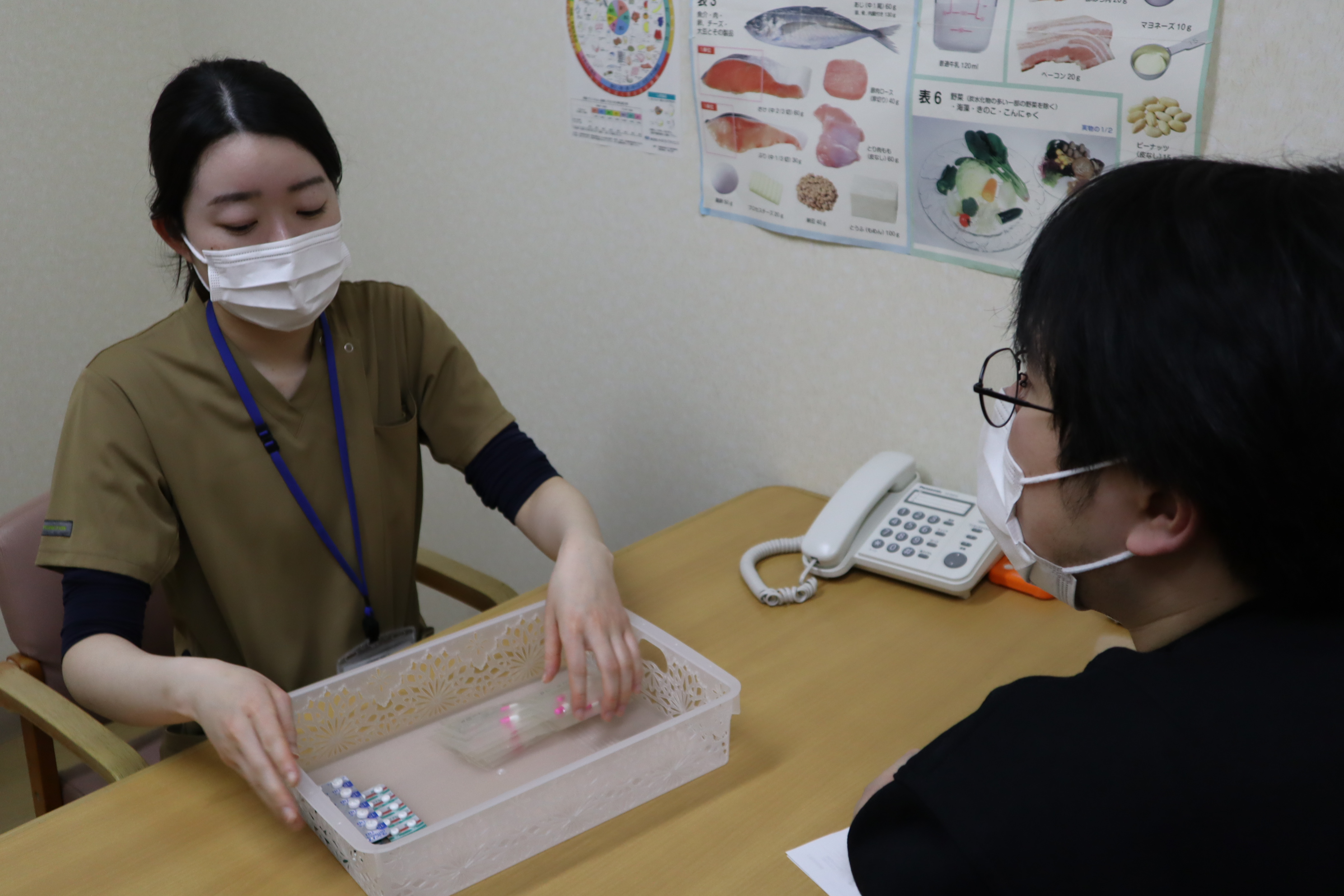 薬剤管理指導入院患者様に薬剤追加・変更があった際は、薬剤師がベッドサイドで説明を行っています。患者様だけでなく、ご家族等にも説明を行い、薬について分からない事があればいつでも薬剤師に相談していただけるような環境作りに努めています。 |